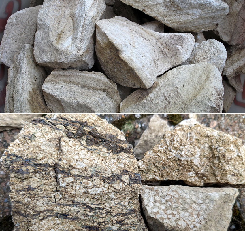Figur 10: Forskjellen mellom stykkalk (brent kalk) brent fra temmelig ren marmor (over) og ganske uren kalkstein med masse fossiler (under). Her ser en brent Mostermarmor og brent kalkstein fra Grenland. Marmoren gir hvit, sub-hydraulisk mørtel, kun med en beige teint, kalksteinen en svakt til middels hydraulisk mørtel med svakt lysebrun farge. Foto: Per Storemyr
