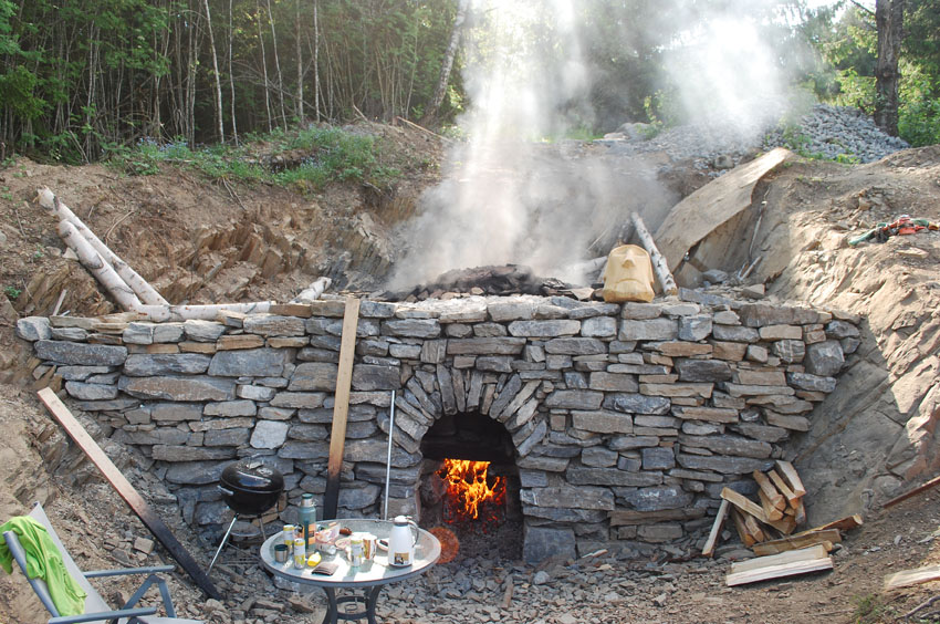Figur 11: Kalkovnsanlegget til Tore Granmo på Helgøya, bygd i 2021. Den sylindriske ovnen har en kapasitet på ca. 10 tonn kalkstein og er bygd inn i et utsprengt søkk. Foto: Per Storemyr