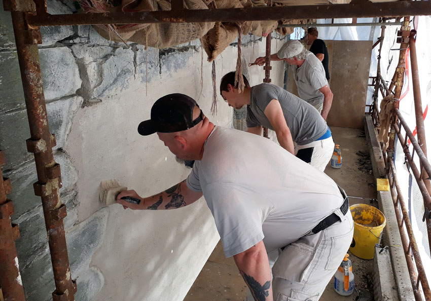 Figur 12: Kursing er viktig for opplæring i bruk av tradisjonell kalk. Her fra restaurering av Sørbø kirke sommeren 2022 med Mosterkalk brent i Mosterhamn. Foto: Per Storemyr
