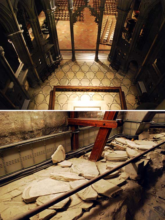 Marble floor in the octagon of Nidaros cathedral. The current floor is a reconstruction, but some of the old stones are stored on the gallery above