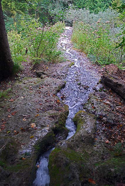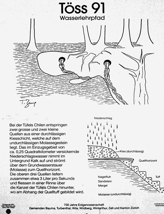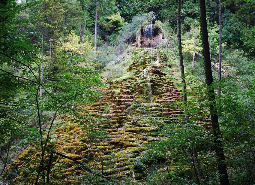 At first sight the place, in a small valley not far from Winterthur, seems like a pure natural wonder. Water trickles down dozens of tiny terraces in the calcareous tufa, developed over some thousands of years to an almost perfect, 60 m high cone in the densely forested hillside. The tufa has formed from water penetrating moraine gravel, coming to the surface as small springs on reaching an impermeable layer of marl in the local Molasse sandstone.