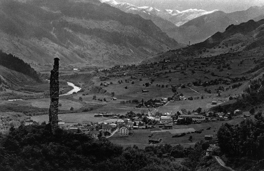 The impressive "Mauerzahn" of the castle at Friberg by Trun in Surselva in 1911 before the collaps shortly after. Image source: Poeschel 1929.