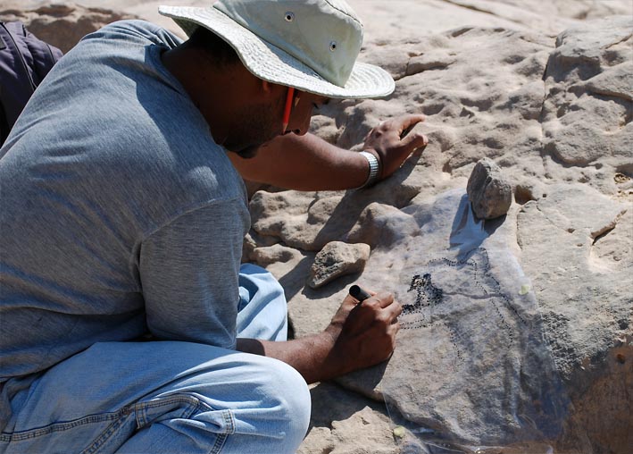Adel Kelany recording a Late Palaeolithic petroglypph: Photo: Per Storemyr