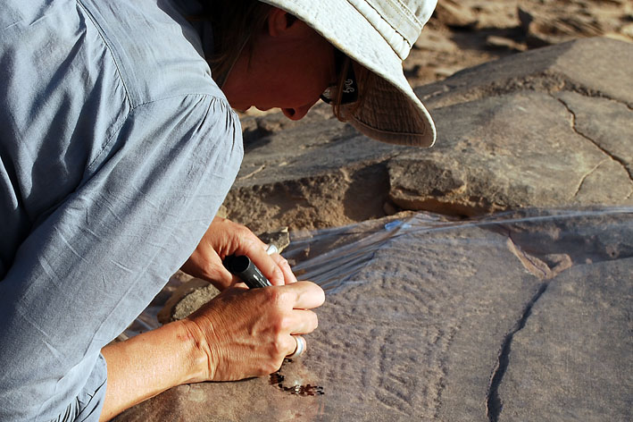 Isabelle Therasse of the Royal Museums of Art and History in Brussels tracing the Epiplalaeolithic rock art masterpiece in 2010. Photo: Per Storemyr