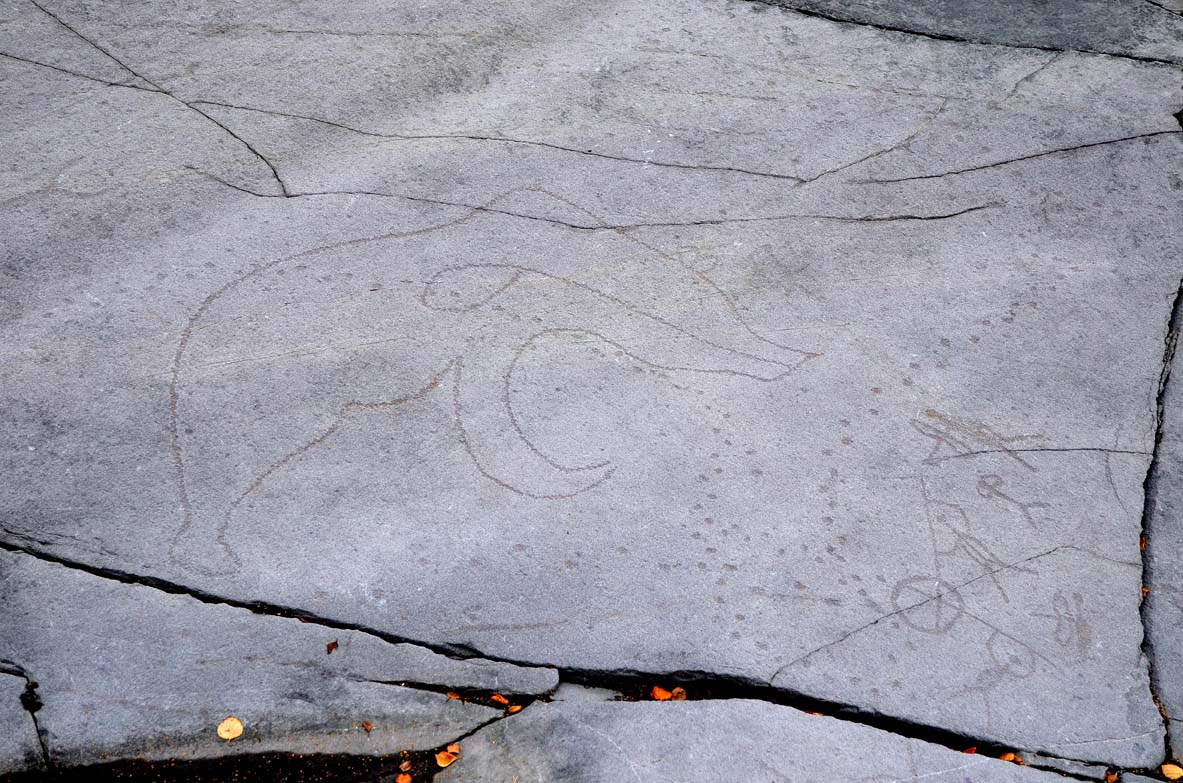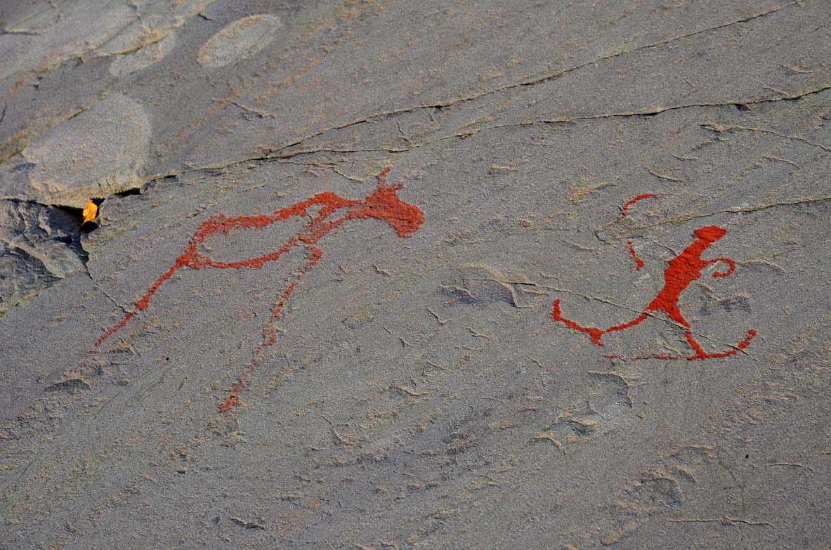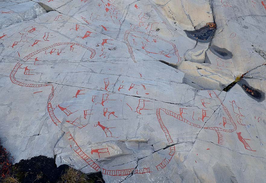 Depictions of snow shoes attest to the arctic landscape this rock art was made in. But there is more; one figure seems to have skies on hunting elk! A testimony of the long skiing traditions up north!
