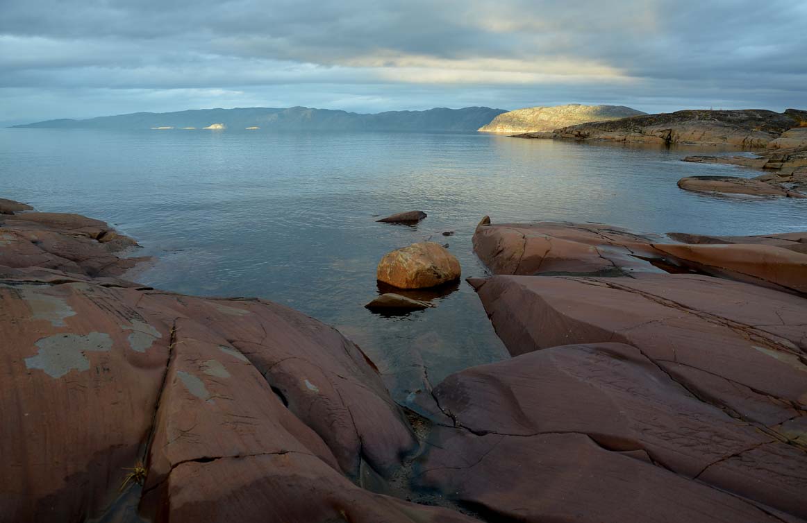 The current shoreline in at Alta, with reddish patinated bedrock. The surface features of the rock is otherwise a result of ice-scouring during the last Ice Age. The natural colour of the rock can be seen in the areas with exfoliation. Photo: Per Storemyr