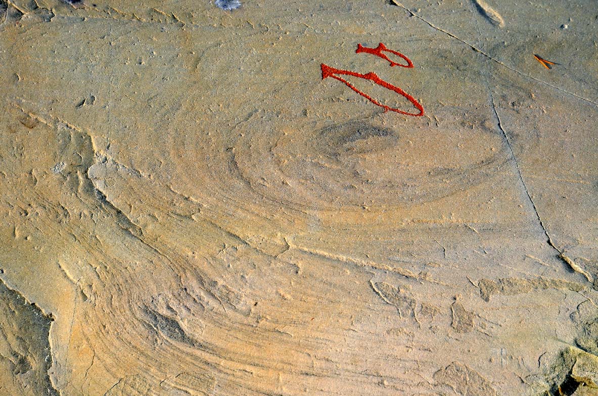 The thin laminae in the Alta bedrock may invoke much imagination. What about the image below? Is it depicting two small whales (porpoise) swimming down a maelstrom?