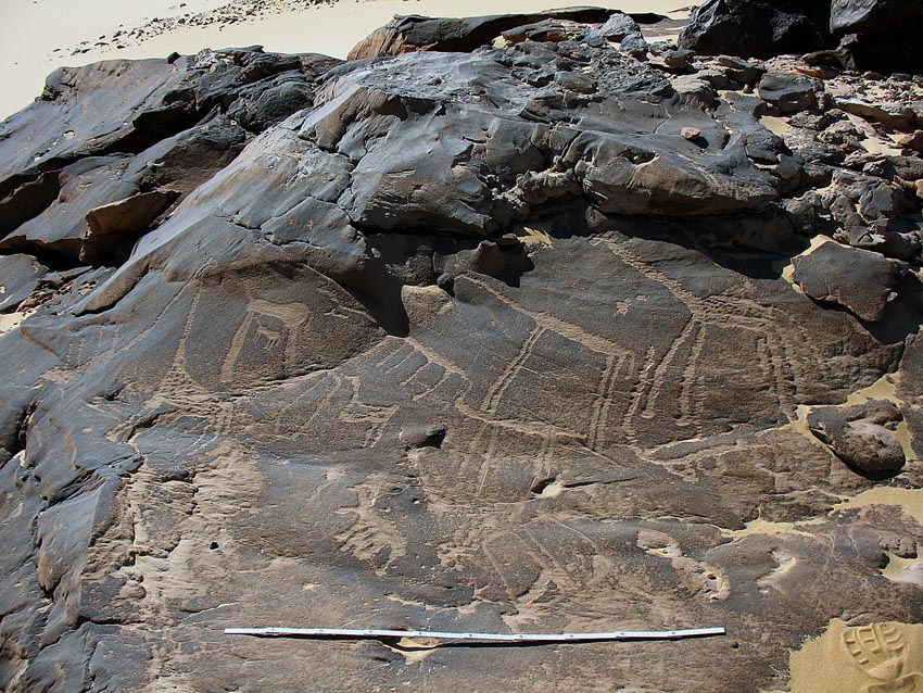 Mushrooms? Penises? No, these are depictions of more than 7000 year old fish traps at el-Hosh in Upper Egypt. Arrows indicate the movement of fish to be trapped. Photo: Per Storemyr