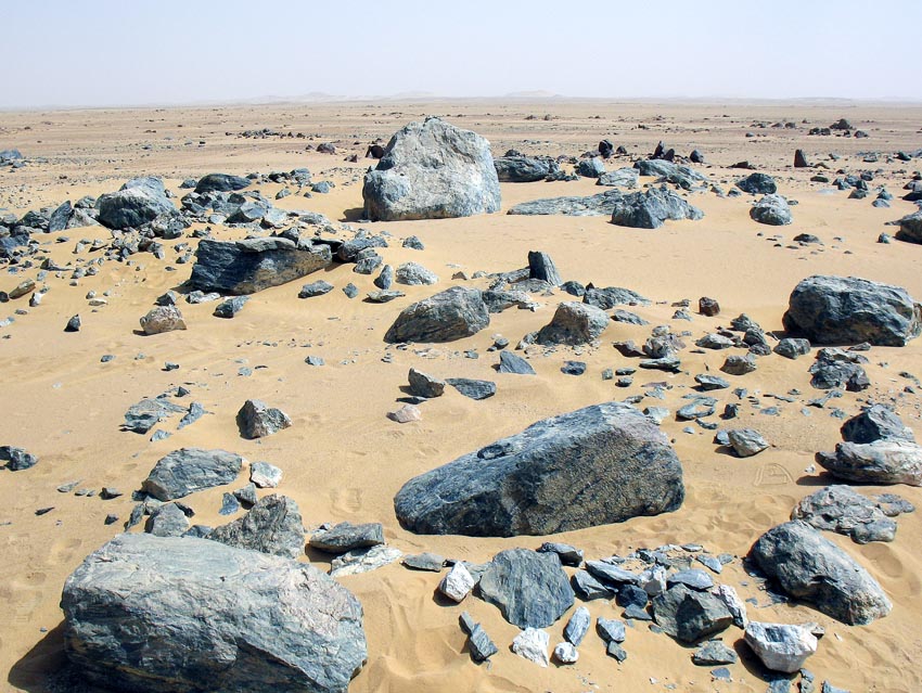 Most of you have heard about the famous, vast Old Kingdom Chephren’s Quarry in the far south of the Western Desert of Egypt. There are hundreds of quarry workings, which took advantage of clusters of big boulders in a flat desert, in total covering an area of almost 100 square kilometres. But there are also expanses of nothing but sand in between major workings. Except at one place, in the middle of nowhere. This is where “the loner” seems to have carried out his work, leaving one half-finished vessel blank, one almost intact hammerstone and one broken one. 5000 years ago.