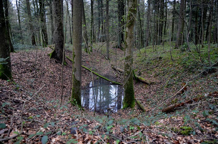 Overgrown quarry pits and raised spoil heaps in the old Riniken millstone quarry landscape by Brugg in Canton Aargau, Switzerland. Photo: Per Storemyr