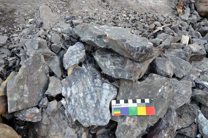 An additional indicator of elevated temperatures is a range of sharp-edged chert fragments with a dull, white colour. The natural colour of the chert ranges from shiny greyish white to bluish and purplish. It becomes dull white upon exposure to fire above, say, 300-400 centigrade, which we have tested by burning it in bonfires. This is a result of microcracking leading to increase in surface area, which alters the light reflection properties of chert.