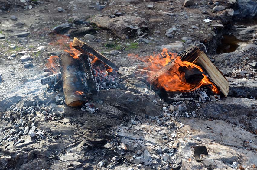 Each fire had a diameter of about half a metre across, generally consuming some 10-20 small birch logs. The objective with two or more fires beside each other was to create shear stress in the area in between and simultaneously keep the temperature low in these areas. Such fires performed the best, both at sloping surfaces where we knew the rock was under significant natural tension and around slightly elevated outcrops. The chert usually started to break at the surface after only 5-10 minutes, whereas it usually took some 45 minutes to one hour to create deep, lateral cracks more than 15 cm below the rock surface, for example between two fires.