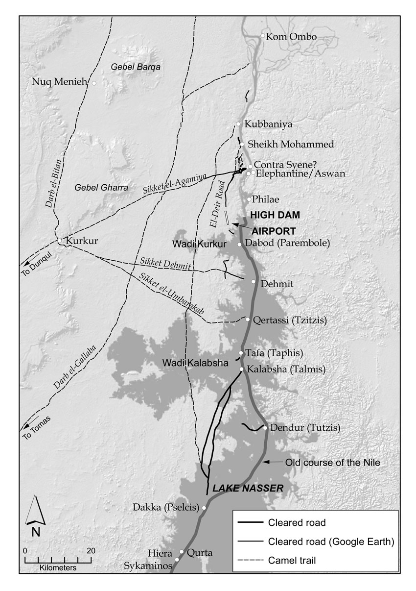Map of desert roads and trails on the west bank of the Nile in the first cataract region and beyond. The cleared roads are verified in the field, or located with the aid of Google Earth. Sections between Kalabsha and Dakka have been reproduced from Hester et al. (1970: fig. 1). The location of selected routes of camel caravan trails is approximate and based on Survey of Egypt (1949) and Army Map Service (1959). Map: Per Storemyr