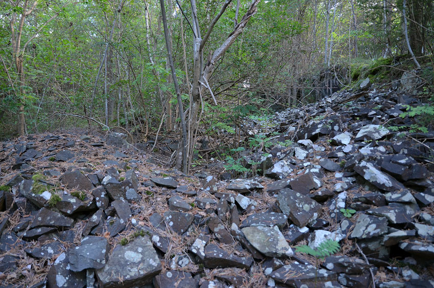 Fra det største diabasbruddet på Hovedøya. Her ser vi store hauger med stein som har blitt sortert etter deres størrelse. Helt til venstre er en haug med pukkstein. Foto: Per Storemyr.