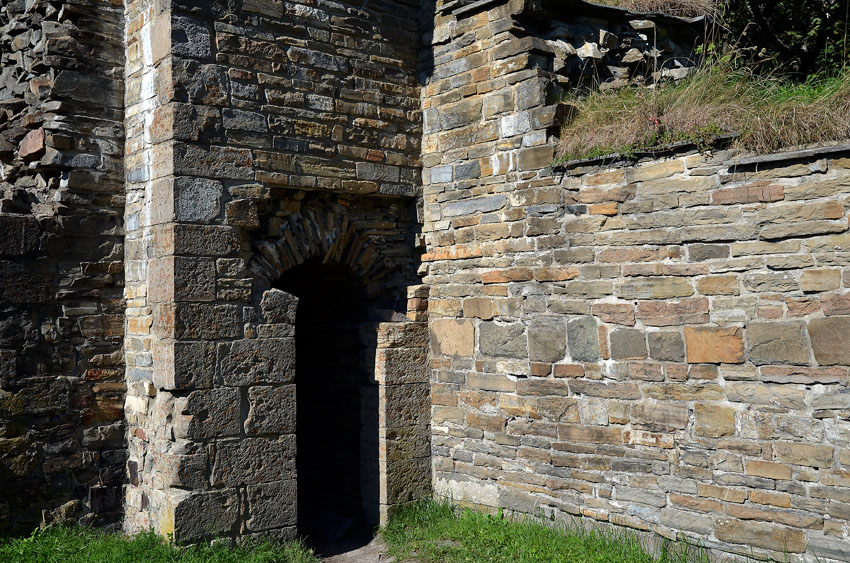 Parti fra Edmundskirken på Hovedøya. Vi ser regelmessig sandsteinsmurverk til høyre, med et bånd av vulkanske bergarter midt i veggen. Kvadersteinene omkring portalen er hogget av ortocerkalkstein brakt til Hovedøya fra fastlandet. Foto: Per Storemyr