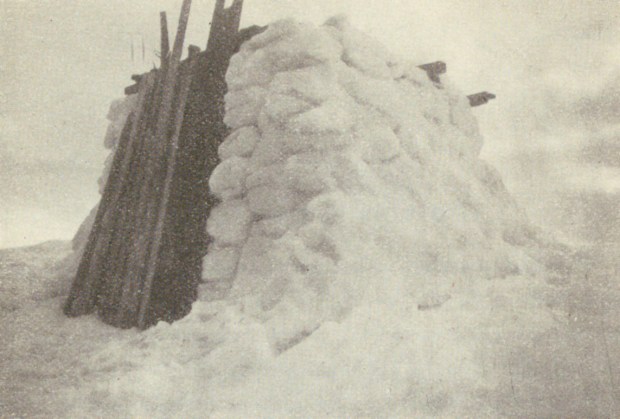 “Hoggarhus” i Selbu. Det var kaldt å bryte og hogge kvernstein på fjellet i Selbu i gamle dager. Snøhytter var løsningen! Foto fra Rolseth 1947.