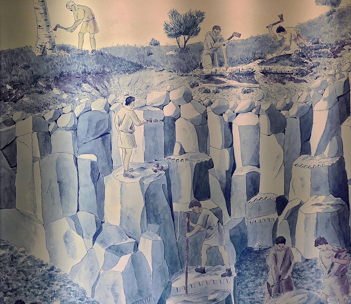 Slik tenker man seg brytning av basaltsøyler i de store kvernsteinsbruddene i Mayen i Tyskland. Fra utstillingene i Vulkanpark Eifel. Foto: Per Storemyr