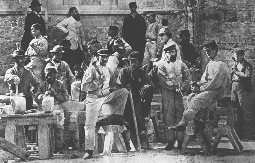 Steinhoggere og andre arbeidere ved Nidarosdomen i 1872. Foto: Wikipedia