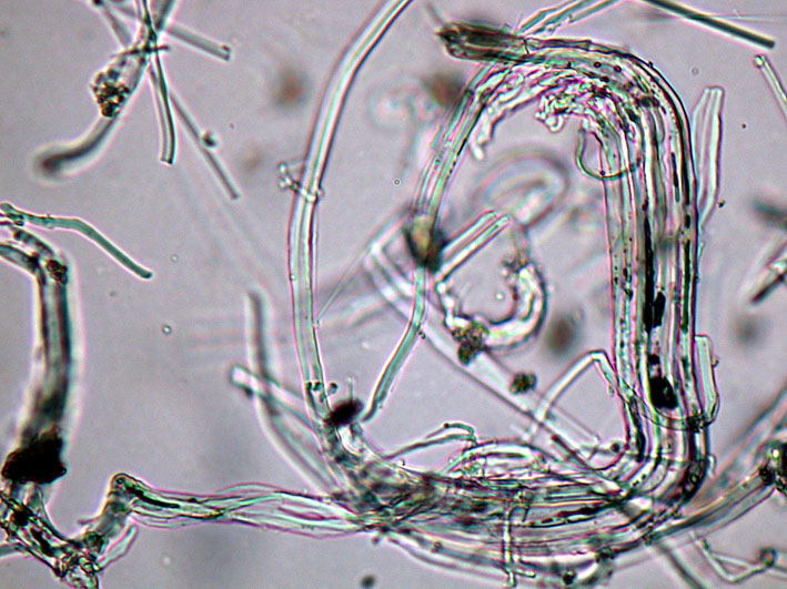 Mikrokjemi. Slik ser det ut under et enkelt mikroskop når vismutsulfat reagerer med natrium i saltprøven din: Det dannes stavformede krystaller av natrium-vismut-sulfat, en entydig bekreftelse på at det er natrium i saltprøven. Foto: Christine Bläuer, se denne artikkelen