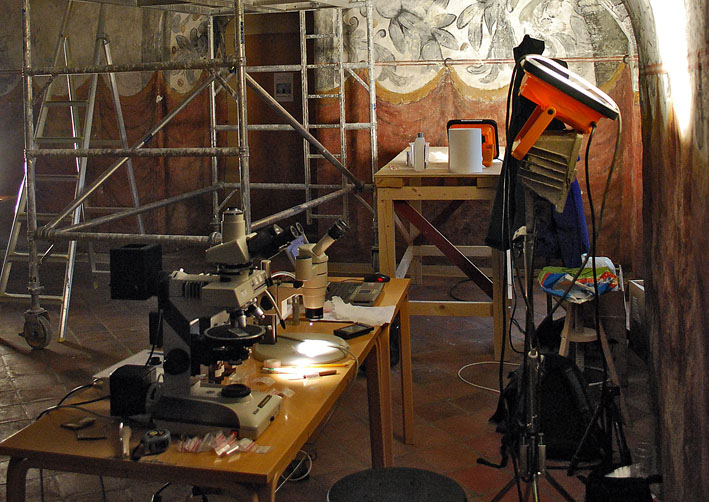 En kjøkkenlab. Eller rettere sagt en midlertidig lab for å analysere store mengder saltprøver i det sterkt dekorerte Regalierommet i Erkebispegården i Trondheim. Her er stillaser for konservering, lamper for å se godt – og polarisasjonsmikroskop, stereolupe, teststrips og et utvalg kjemikalier for å analysere salt. Foto: Per Storemyr
