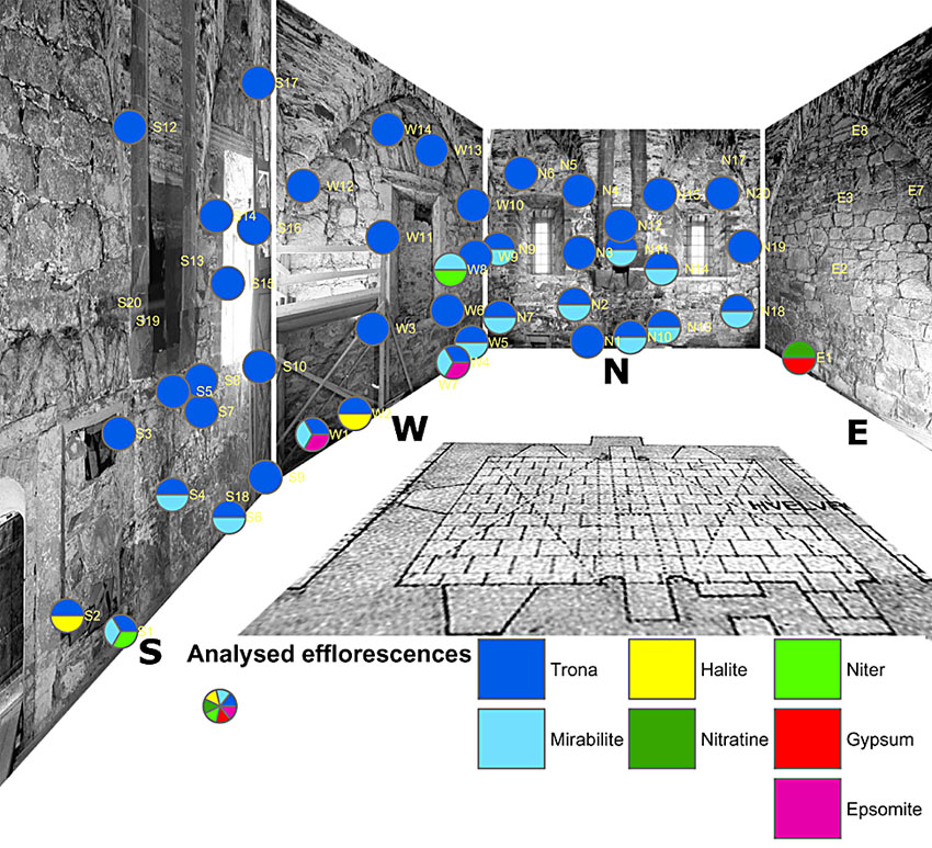 Det er dette vi streber etter: En forståelse av fordelingen av salttyper som ødelegger for eksempel middelaldermurverk. Her 40-50 saltprøver fra Vesthuset (ca.1250) i Erkebispegården i Trondheim. Saltkilder og forvitringsmekanismer er svært komplekse i dette tilfellet. Men det tok bare noen timer å analysere alle prøvene i “kjøkkenlabben”. Illustrasjon: Per Storemyr