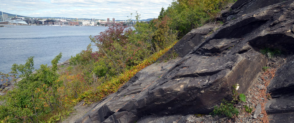 Sandsteinsbrudd på Hovedøya. Vi ser fra bruddet og rett mot Oslos havnebasseng. Dette er ikke er veldig gammelt brudd, men på akkurat det samme stedet der det ble brutt ut stein til klosteret i middelalderen. Foto: Per Storemyr