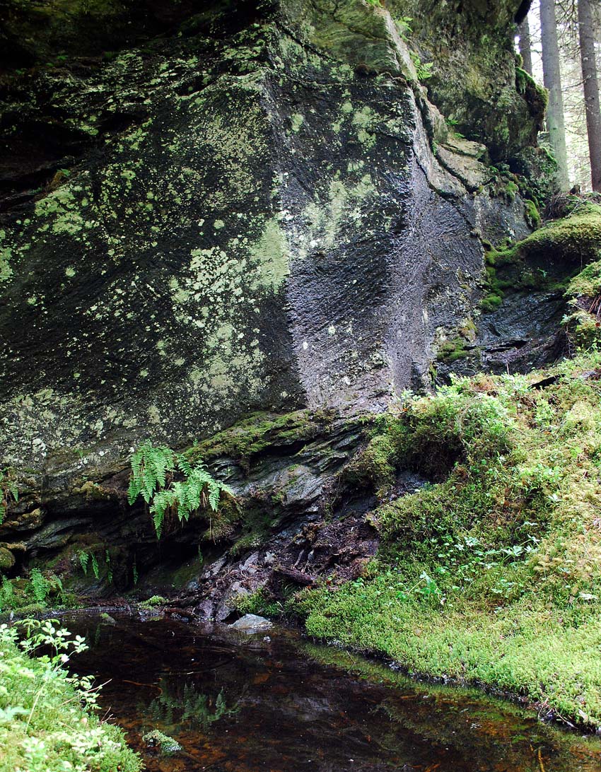 Et av Norges mange klebersteinbrudd som ennå ikke er registrert i Askeladden: Husby i Sør-Trøndelag – et svært brudd som ble mye brukt til de middelalderske bygningene i regionen. Dette er et av Norges best bevarte bygningssteinbrudd fra middelalderen. Foto: Per Storemyr
