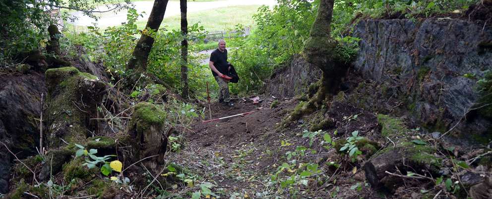 Arkeologisk utgraving av gammelt steinbrudd rett ved Reins kloster. Det er Hans Marius Johansen fra Sør-Trøndelag fylkeskommune som er graveansvarlig. Foto: Per Storemyr