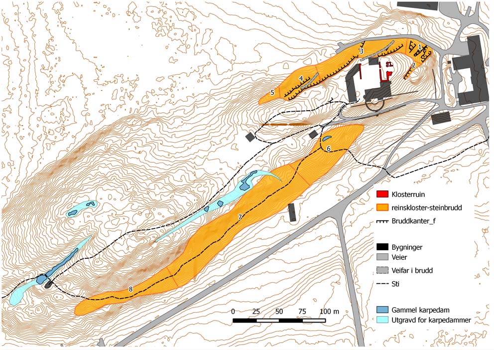 Kart over steinbruddene ved Reinskloster. Totalt dekker de gamle bruddene nesten 15 mål i det overgrodde landskapet. Kart: Per Storemyr og Hans Marius Johansen