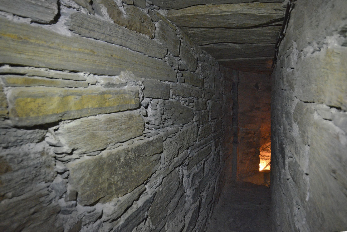 Gangen mellom første og andre høyde i tårntrappen viser bruken av sandstein til både vegger, golv og tak. I golv og tak er det brukt store, splittede sandsteinsplater. Legg også merke til bruken av små, flate sandsteinsbiter i fuger. Foto: Per Storemyr.