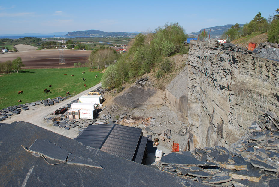 Sorte skiferbrudd slik det tar seg ut i dag. Dette er det eneste av skiferbruddene i Stjørdal som har overlevd frem til vår tid. I området er det ikke bare skifer, men også Stjørdalsandstein av samme kvalitet som på Værnes kirke. Foto: Per Storemyr.
