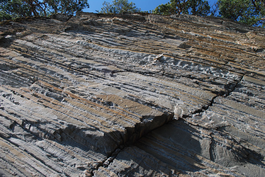 Lagrekke med Stjørdalsandstein ved Storvika på Sutterøya. Her ser vi hvordan steinen tar seg ut i en bratt fjellskrent, vekslinger mellom kompakt sandstein og lett forvitrede lag med kalkmineraler. Steinen er av samme kvalitet som den vi finner på Værnes kirke. Foto: Per Storemyr.
