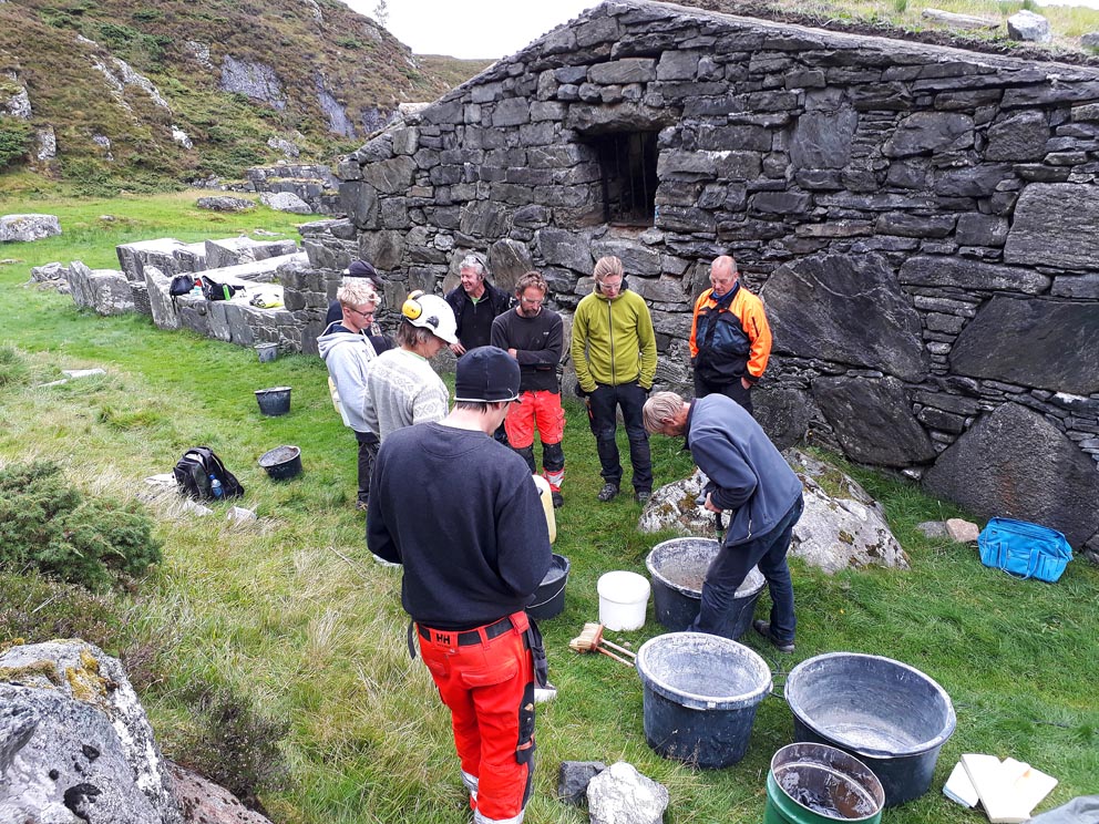 Practical course on using traditional lime mortar at Selja. Mixing mortar (hot mix). Supported by Selje municipality and the Directorate for Cultural Heritage. Photo by Per Storemyr