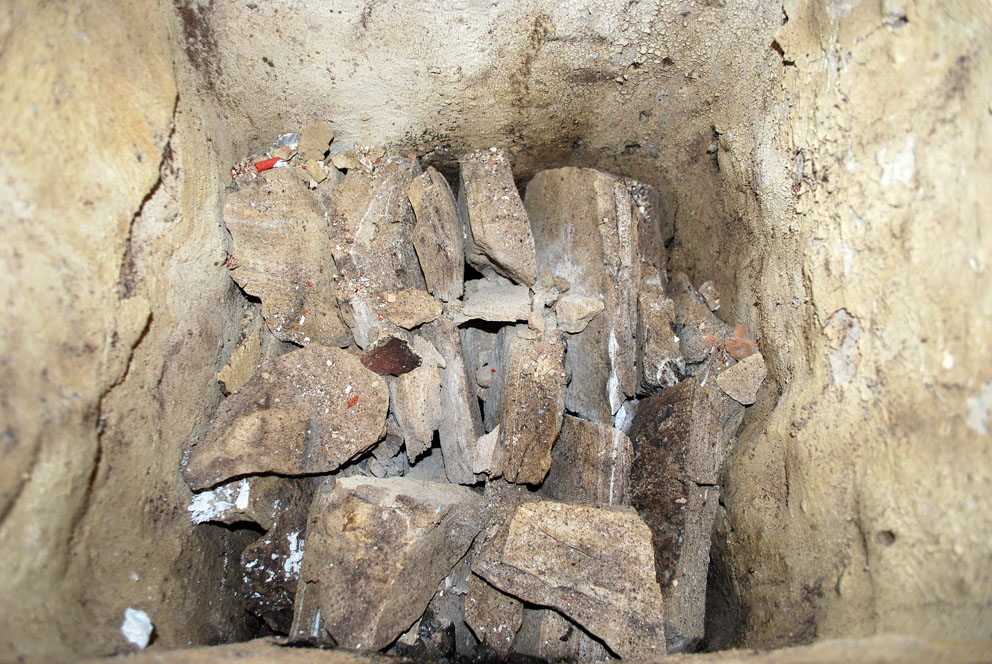 Uttak av den brente marmoren fra ovnen. Kalken har holdt seg godt og er ikke mye “forsukret” av de høye temperaturene. Dessuten er den blå fargen fullstendig borte. Foto: Per Storemyr
