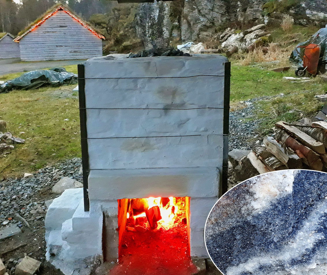 Forsiktig brenning for å drive av fukt i ovn og marmor. Legg merke til at ovnen er forsterket med vinkeljern og streng. Foto: Per Storemyr