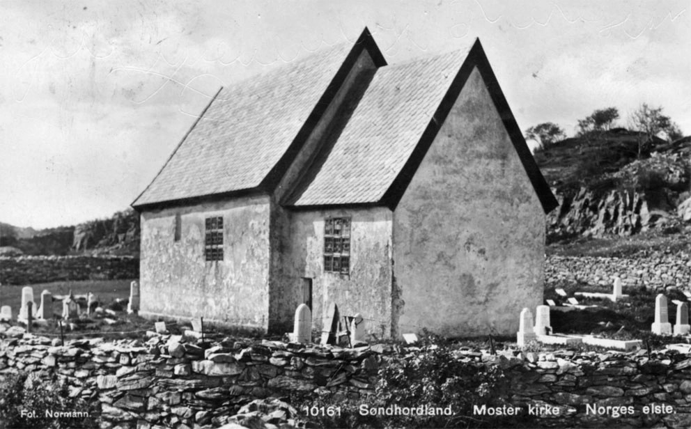 Mosterhamn er historisk, med Moster gamle kirke. Her fra tidlig 1900-tall med marmorbrudd som skimtes i bakgrunnen. Kilde: Digitalt Museum – https://digitaltmuseum.no/011012831984/moster-kyrkje