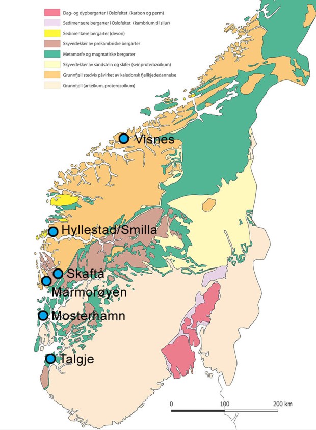 Sju vestlandske marmorforekomster testet i Vesleovnen. Hver forekomst har ofte et par ulike typer marmor, slik at reelt antall typer testet er ca. 12. Fra hver forekomst er det hentet flere hundre kilo stein, stort sett ved manuelt arbeid. Fra Hyllestadmarmor er det skaffet mer enn 8 tonn. Geologisk kart: NGU