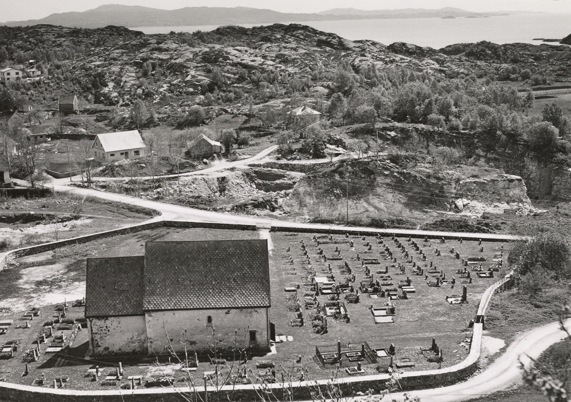 Moster gamle kirke sett fra nord og mot det store steinbruddet sør for kirken. Foto: Hans-Emil Liden 1963, Riksantikvarens arkiv