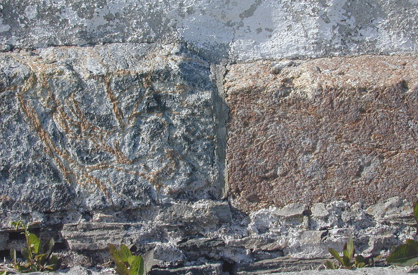 Moster gamle kirke, kleberstein i sokkelen. Foto: Per Storemyr 2001