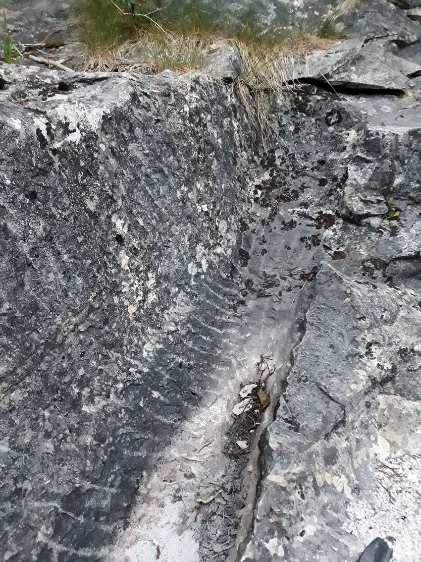 Mosterhamn: Hoggekanal for uttak av marmor i en kant av hva som tidligere ble kalt “Fællesbrud”. Kanalen kan være svært gammel, kanskje fra middelalderen. Foto: Per Storemyr 2022
