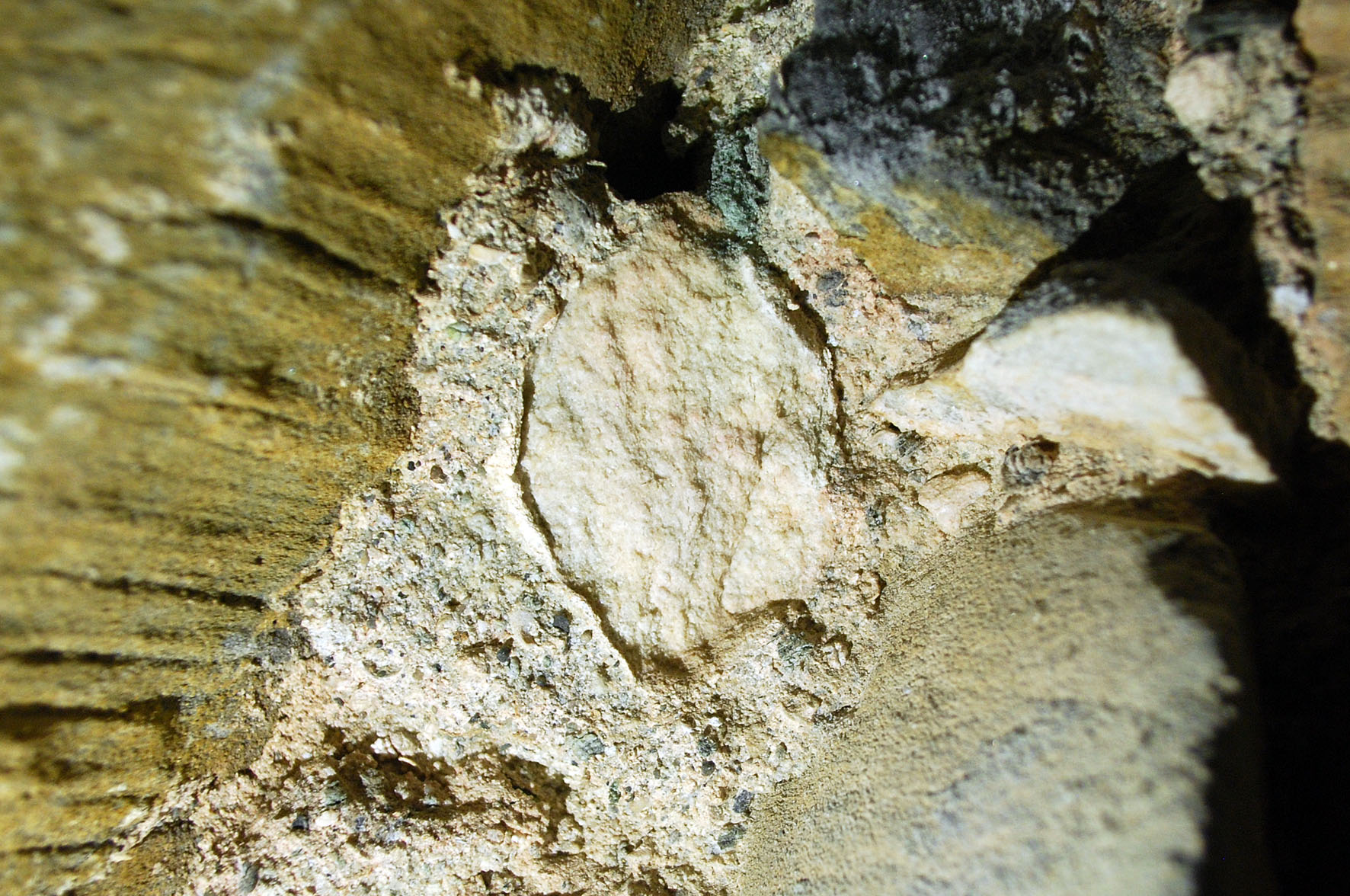 Moster gamle kirke, korets gavl, med stor ubrent marmorkjerne i den middelalderske murmørtelen. Foto: Per Storemyr 2022