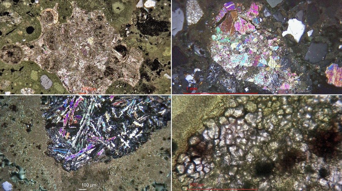 Norwegian medieval lime mortars under the microscope: Top left: Underburnt limestone fragment. Top right: Underburnt contact metamorphic limestone fragment. Bottom left: Slag from burning impure limestone at high temperature. Bottom right: Unhydrated belite from burning impure limestone at moderate-high temperature. Microhotos by Per Storemyr