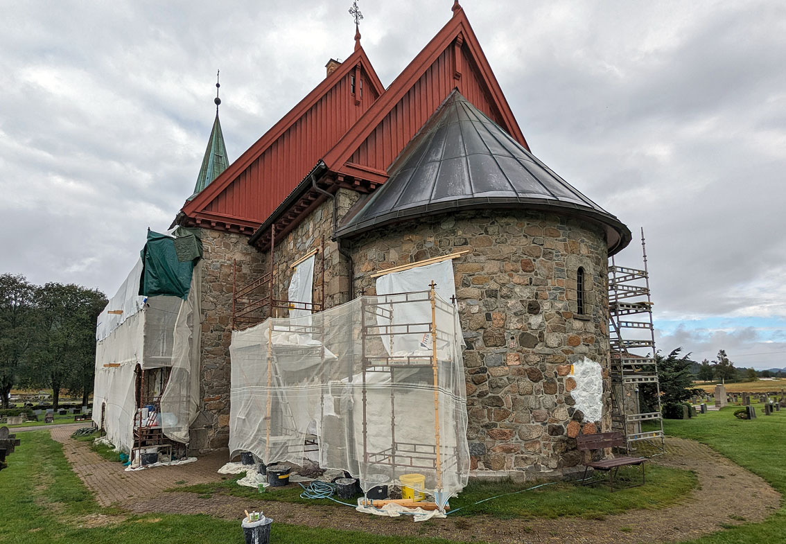 Hedrum kirke under forberedelser til restaurering sommeren 2023, med bl.a. prøvefeltet på kor og apsis. Foto: Per Storemyr
