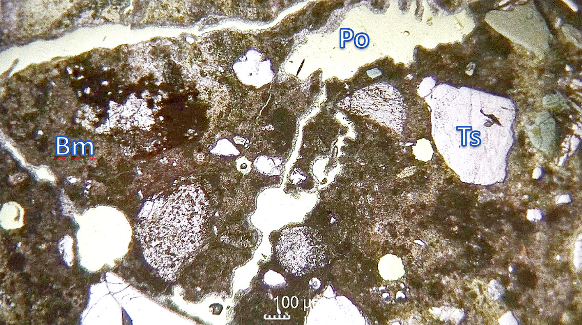 Hedrum kirke. Mikrobilde av den harde, middelalderske kalkmørtelen på skipet. Bindemidelet (Bm) er mørk og hydraulisk. Det er mange riss med utgangspunkt i porene (Po). Sandtilslaget (Ts) er preget av feltspat som er sterkt etset i kantene og bidrar til mørtelens høye styrke. Planpolarisert lys. Foto: Per Storemyr