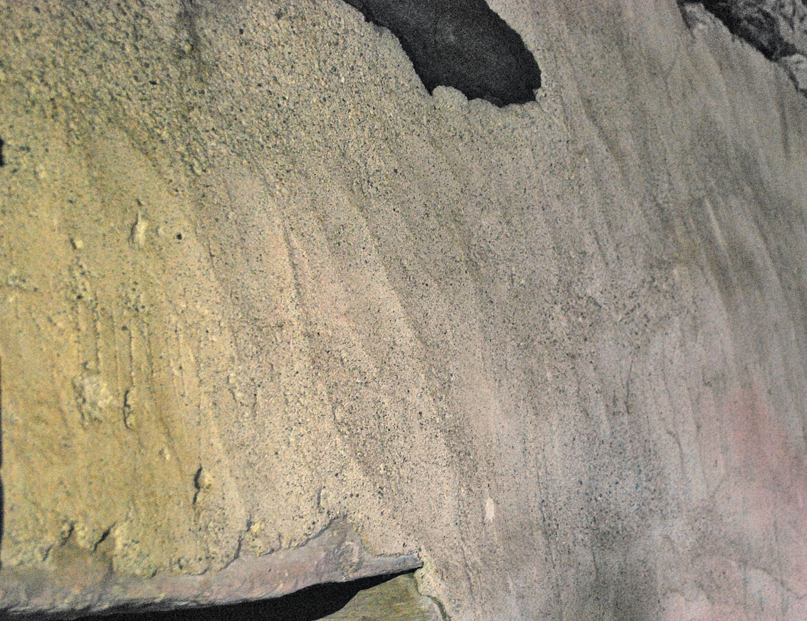Talgje kirke: Middelalderpuss jevnet med murskje på gavlen mellom skipet og koret. Foto: Per Storemyr