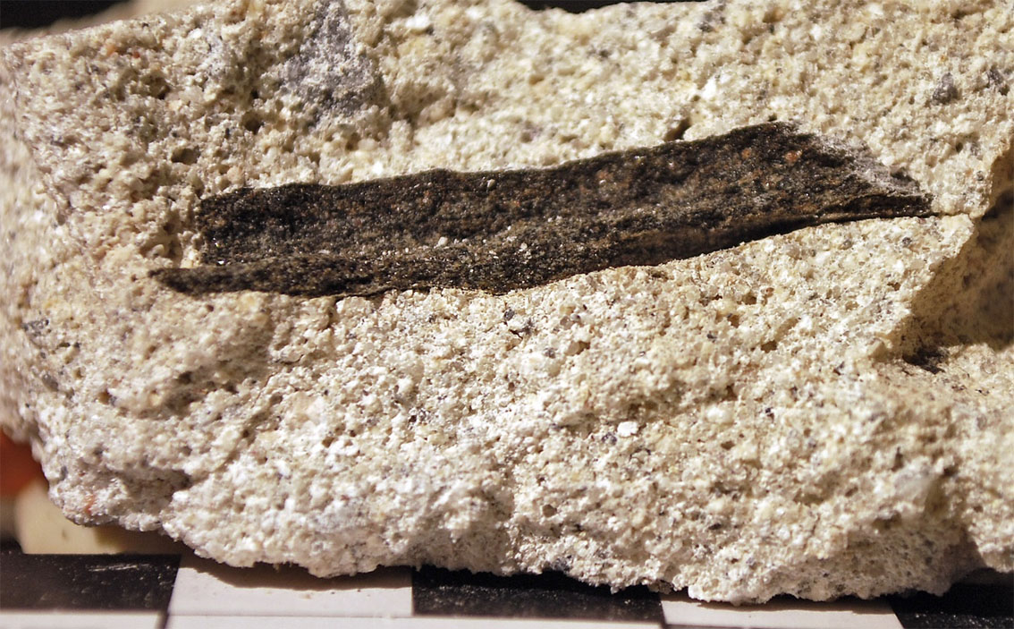 Talgje kirke: Vanlig middelaldersk fuge- og pussmørtel på gavlen mellom koret og apsis. Skala i cm. Foto: Per Storemyr