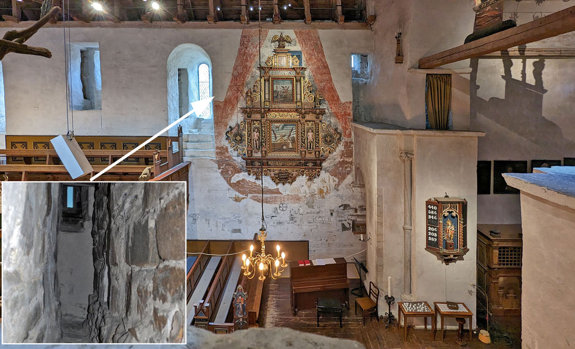 Skipet i Tingvoll kirke, med kalkmalerier på nordveggen. Over maleriene går en del av de unike gangene inne i muren. I veggen som vender mot kirkerommet har det tidligere vært mye fukt, og herfra er det tatt mørtelprøver. Foto: Per Storemyr