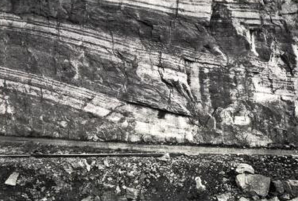 Bruddvegg i enkrinittkalk (“Brevikkalk”) i Brevik by. Lagene heller mot øst. Foto: Holtedahl i “Kalkstensforekomster i Kristianiafeltet”, 1912