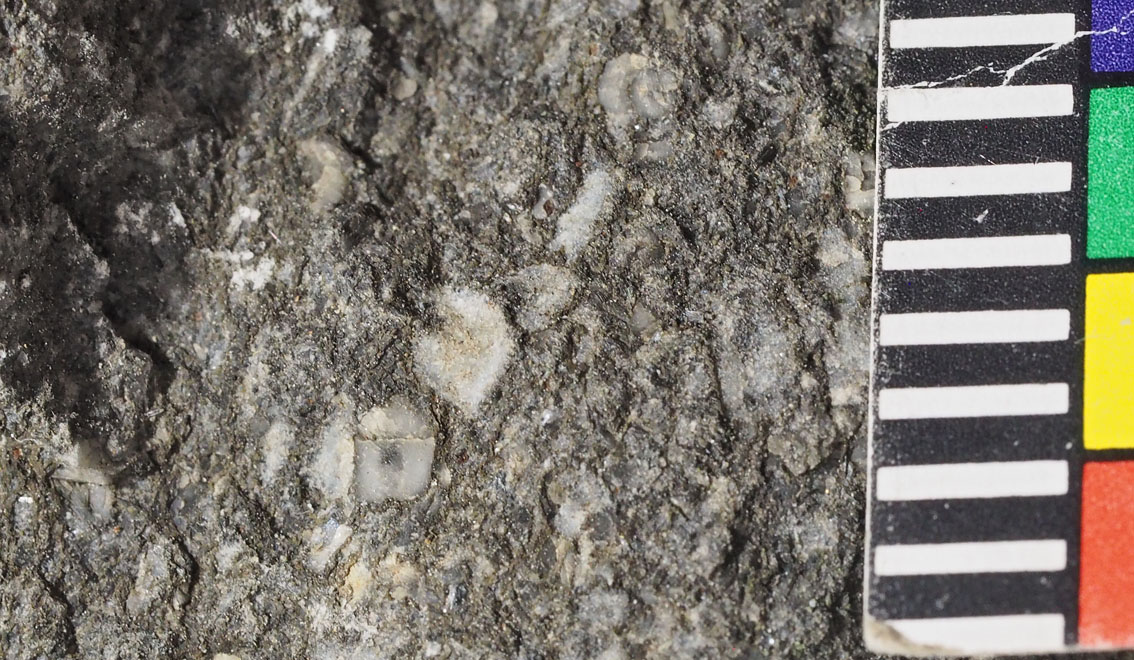Kalksteinen på Kjørholt med karakteristiske, runde fragmenter av sjøliljestilker – enkrinitter (mm-skala)