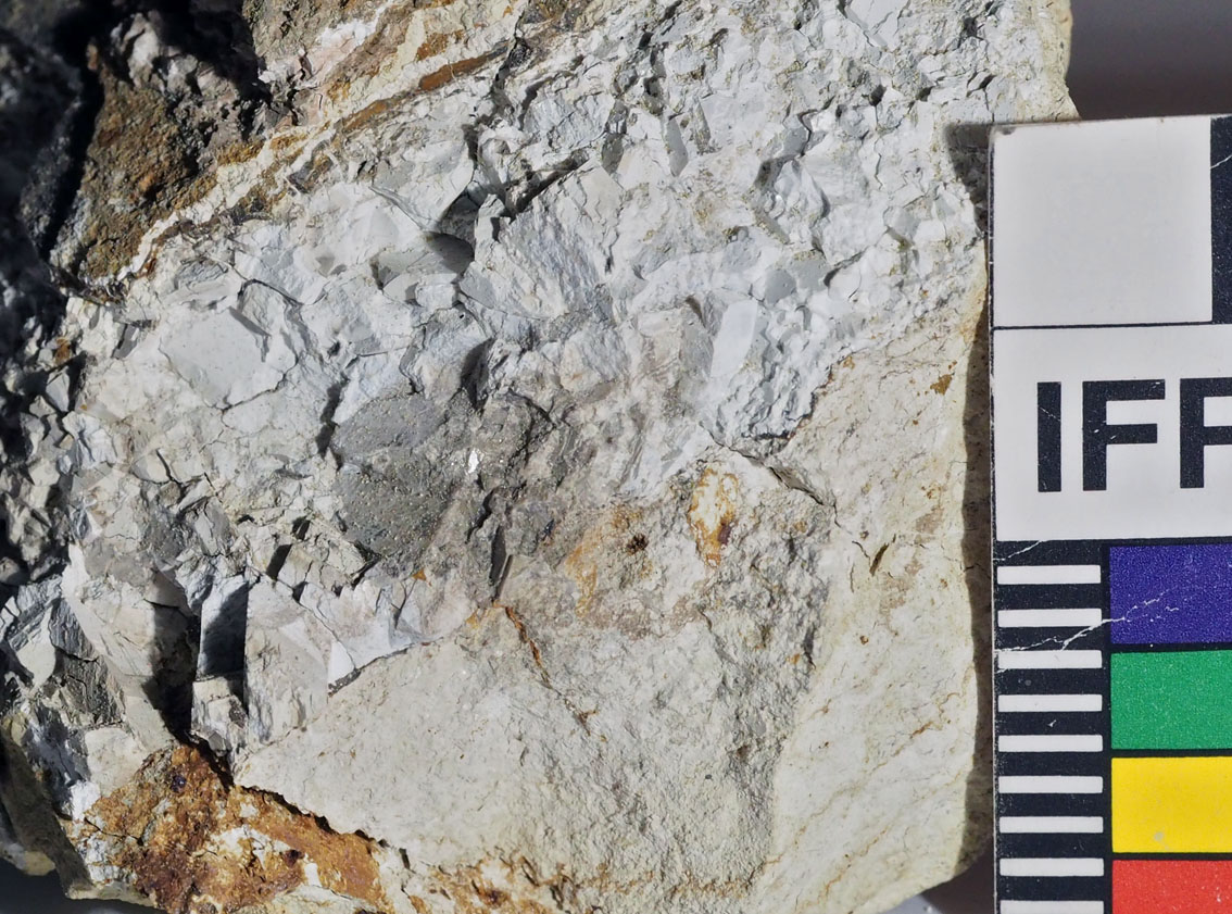 Brent Brevikkalk med grovere åre av “avtrykk” av kalkspatkrystaller og tynn åre med hornfels (mm-skala).